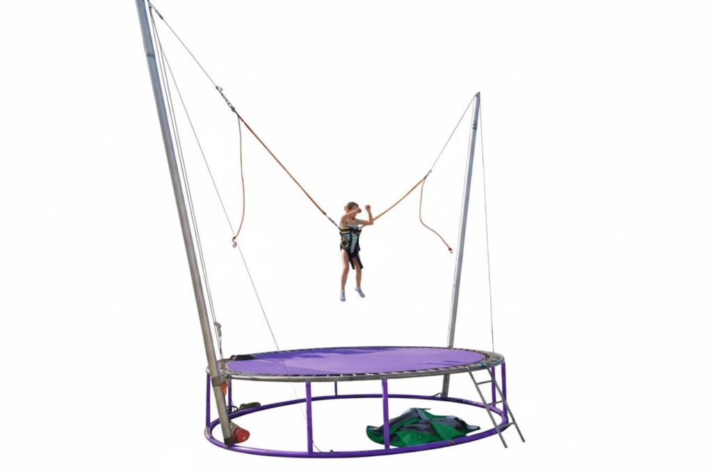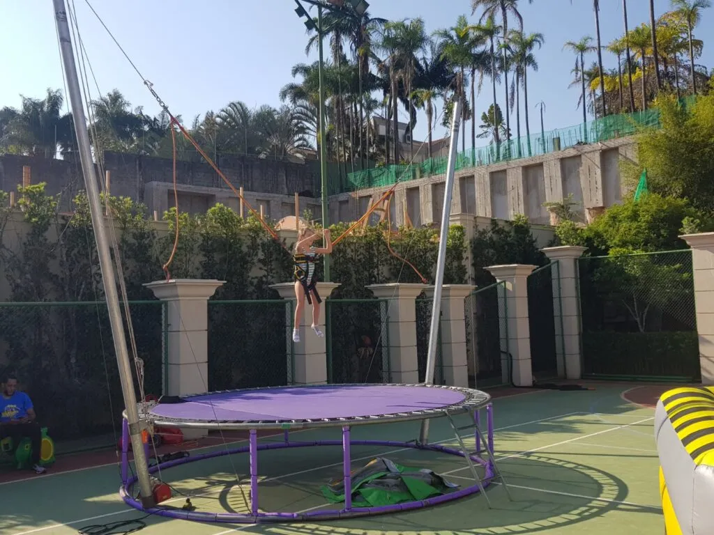 Este equipamento é um sucesso entre crianças e adultos, pois o participante conectado a elásticos e pulando sobre uma cama elástica tem a oportunidade de fazer várias acrobacias e saltos incríveis.